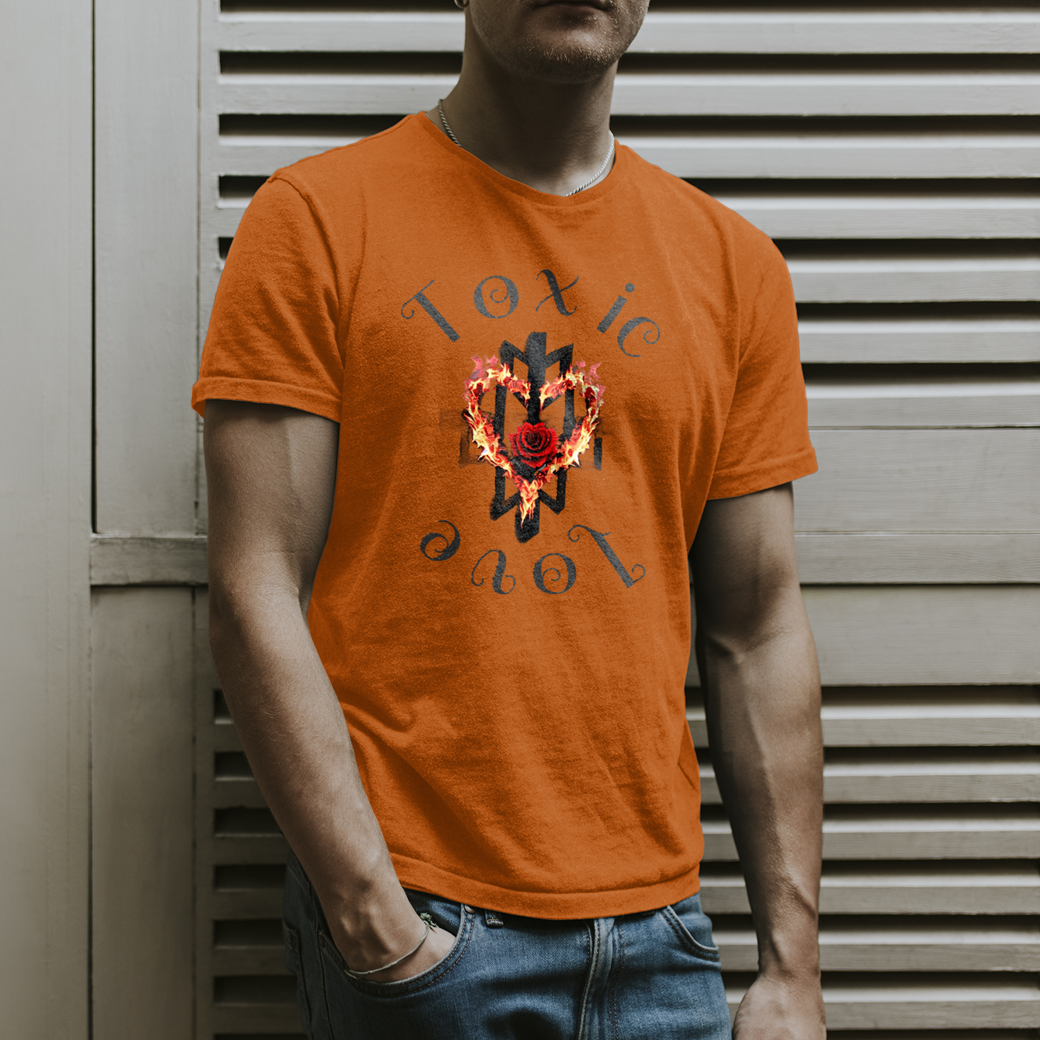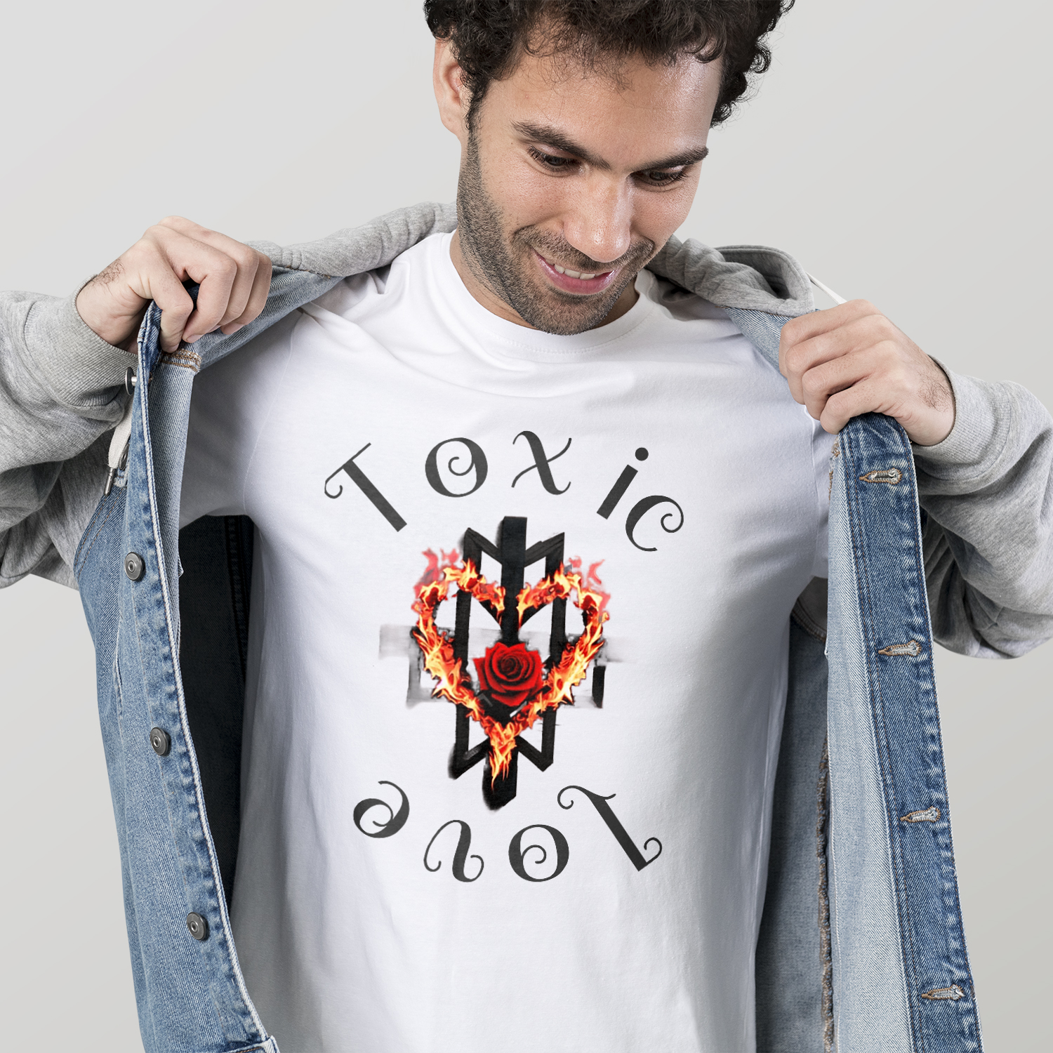 Accendi il tuo stile con la T-shirt Toxic Love, un capo che unisce energia dark e sensualità ardente. Su un cuore di fiamme che avvolge una rosa rossa, simbolo di passioni intense e pericolose. Le scritte gotiche, avvolgenti attorno al design, amplificano il mood ribelle e magnetico di questa maglietta. Realizzata in cotone 100% organico certificato, offre morbidezza, resistenza e rispetto per l’ambiente. Perfetta per chi vive d’istinto e non ha paura di mostrare il proprio lato più audace